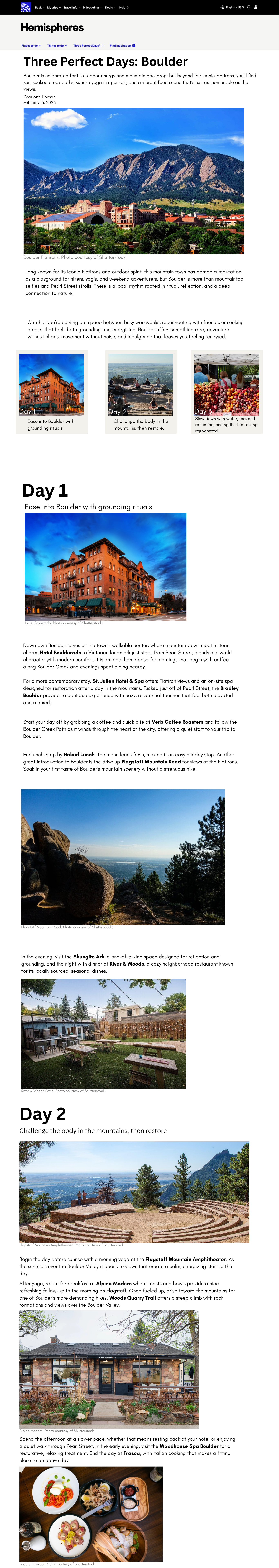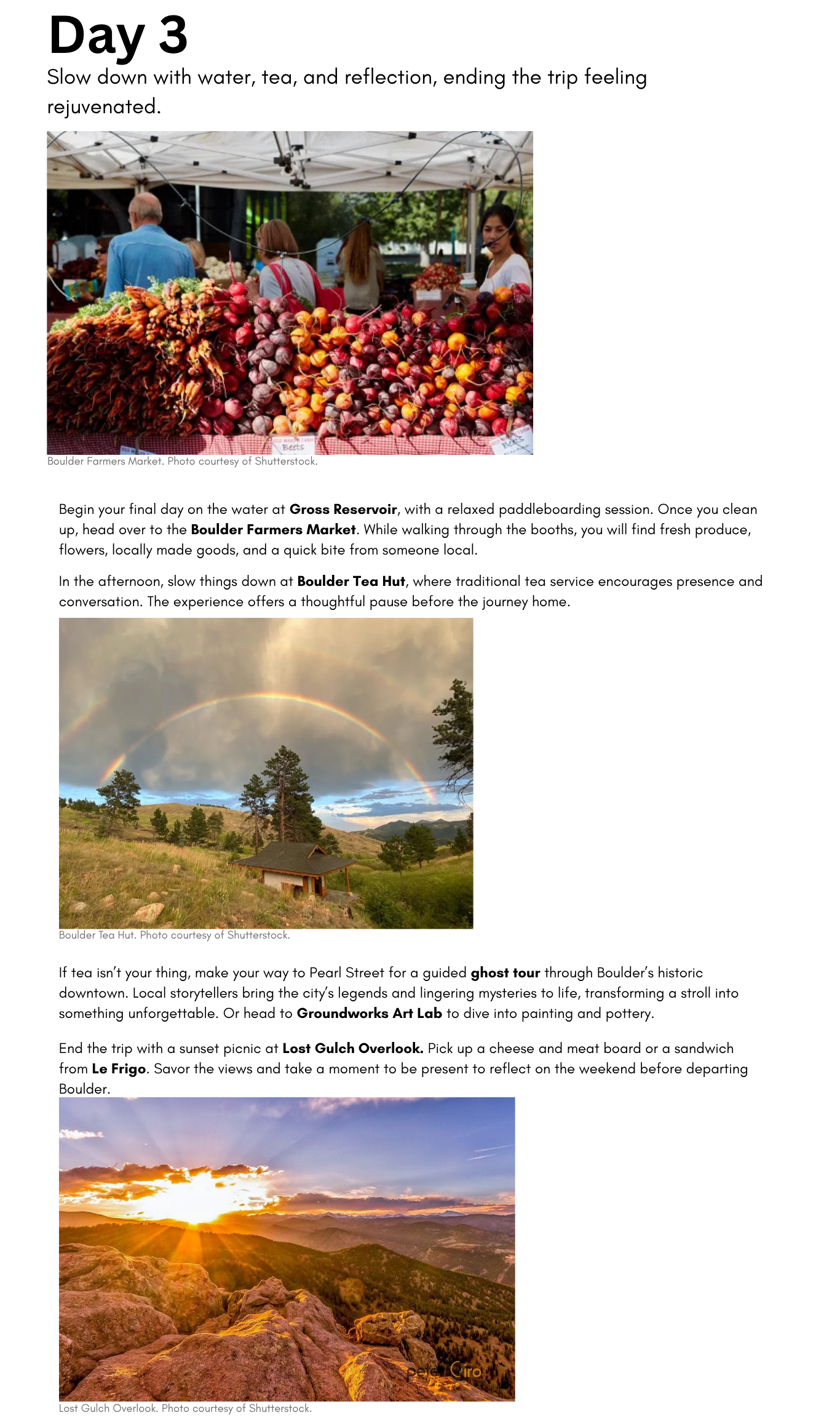 For my senior capstone, I developed a “Three Perfect Days” travel concept for United Airlines, spotlighting Boulder as a destination for balance, adventure, and restoration. The piece blends itinerary design with brand storytelling, guiding travelers through a curated mix of outdoor exploration, local culture, and mindful moments.